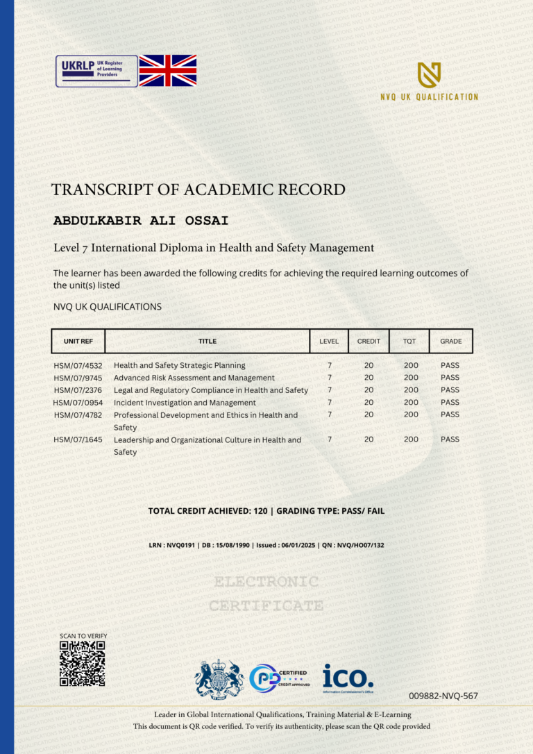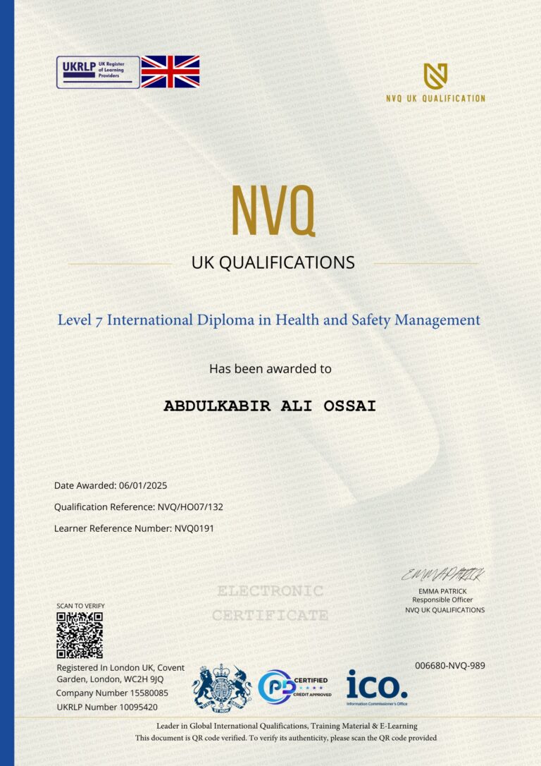 This Certificate is authentic and was issued by NVQ UK Qualification to ABDUL KABIR ALI OSSAI on 06 JANUARY 2025.