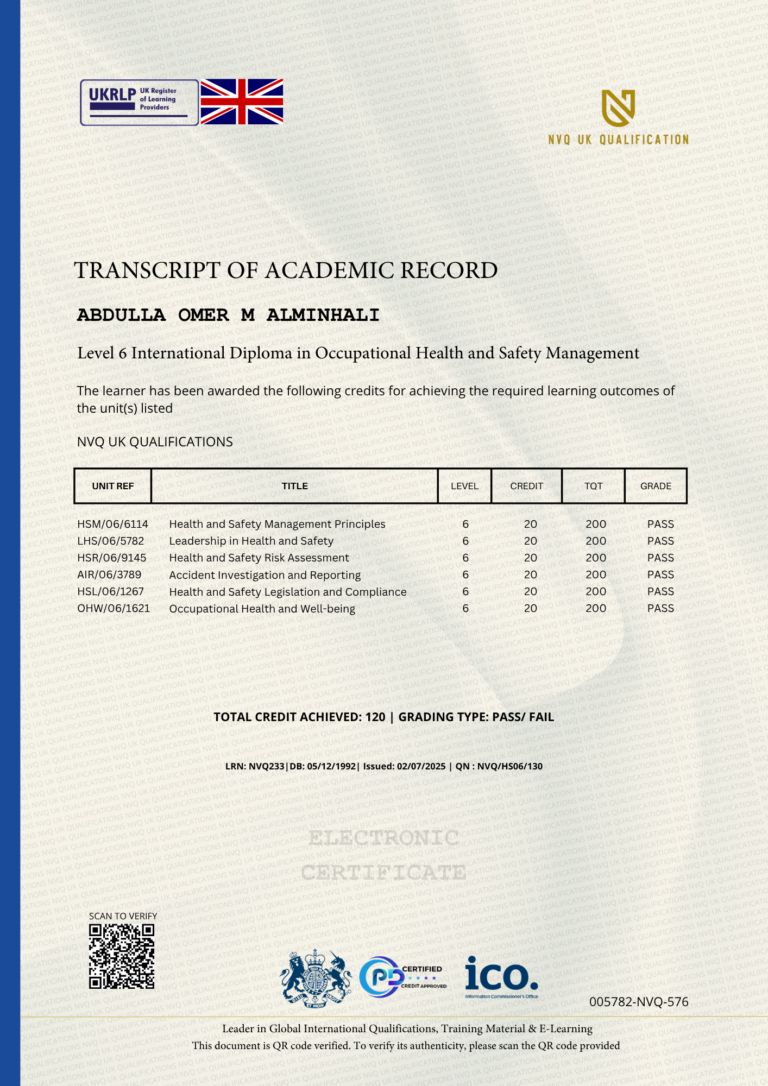 This Certificate is authentic and was issued by NVQ UK Qualification to ABDULLA OMER M ALMINHALI on 02 JULY 2025.