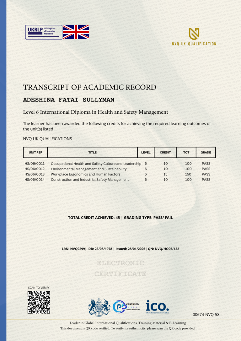 This Certificate is authentic and was issued by NVQ UK Qualification to ADESHINA FATAI SULLYMAN on 28 JANUARY 2026.