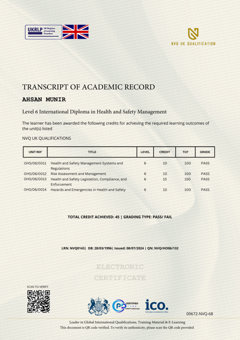 This Certificate is authentic and was issued by NVQ UK Qualification to AHSAN MUNIR on 08 JULY 2024.