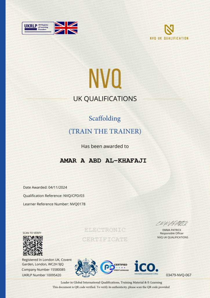 This Certificate is authentic and was issued by NVQ UK Qualification to AMAR A ABD AL-KHAFAJI on 04 November 2024.
