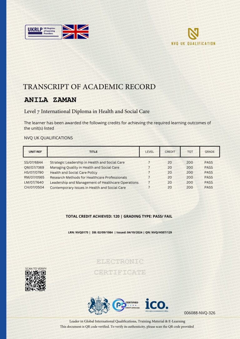 This Certificate is authentic and was issued by NVQ UK Qualification to ANILA ZAMAN on 04 OCTOBER 2024.