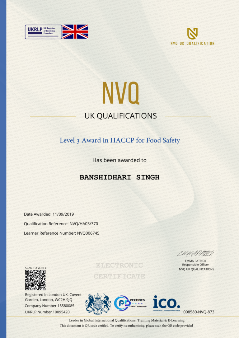 This Certificate is authentic and was issued by NVQ UK Qualification to BANSHIDHARI SINGH on 11 SEPTEMBER 2019.