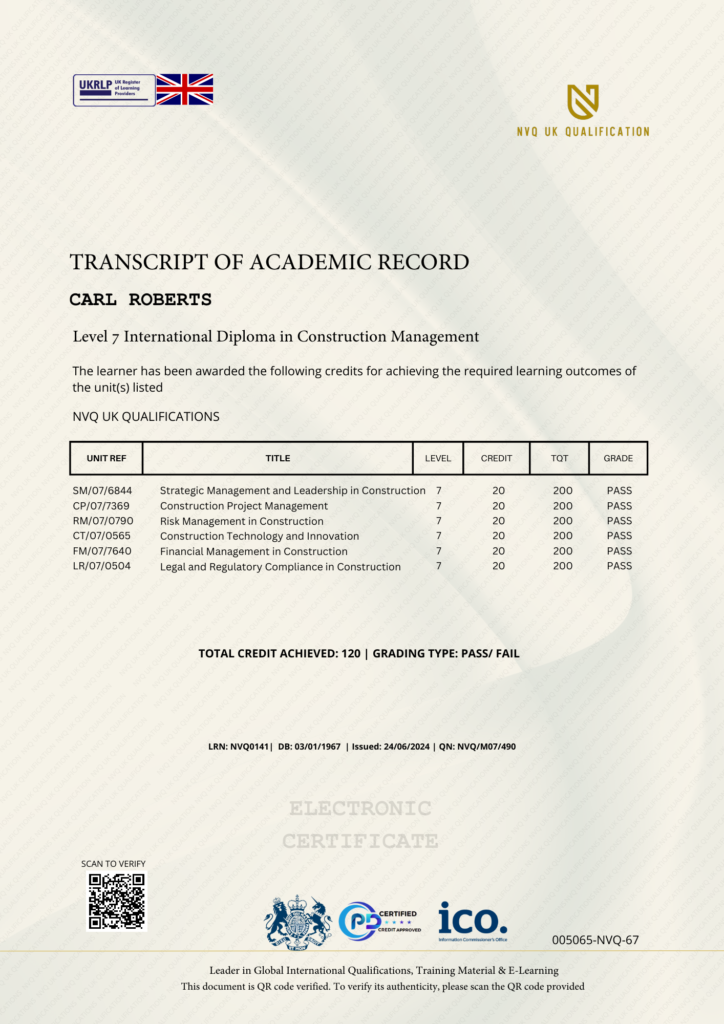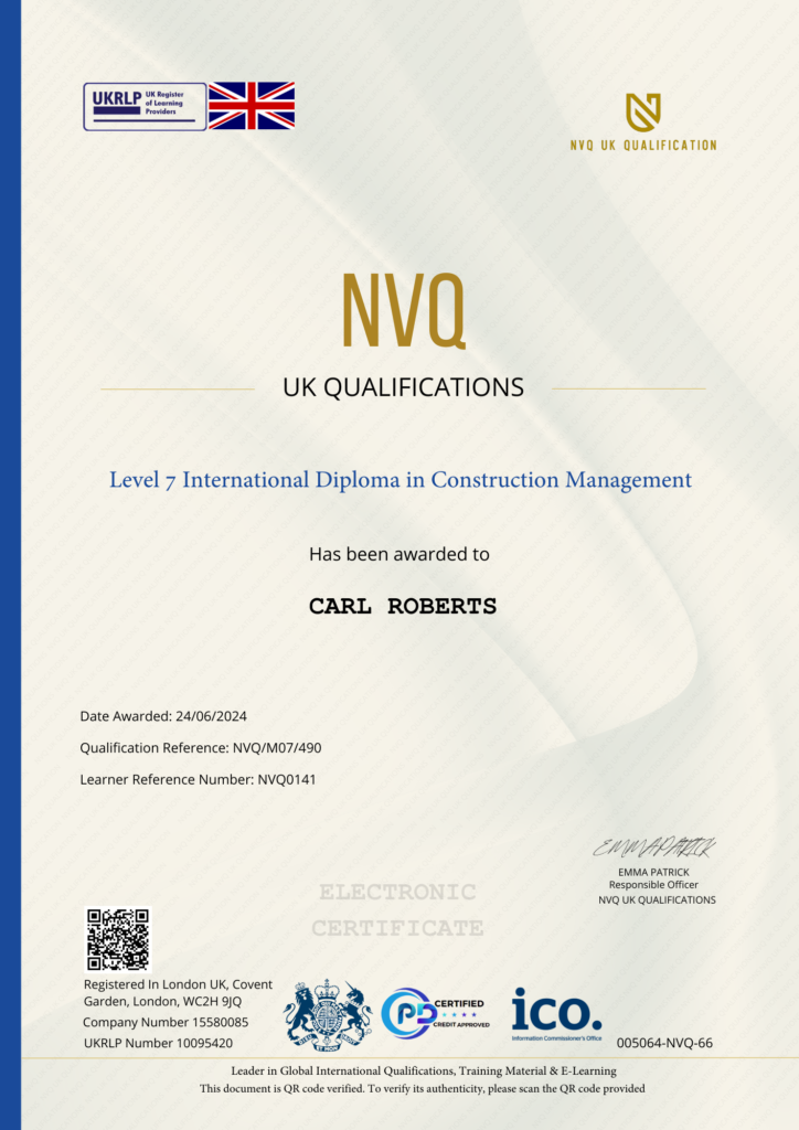 This Certificate is authentic and was issued by NVQ UK Qualification to CARL ROBERTS on 24 JUNE 2024.