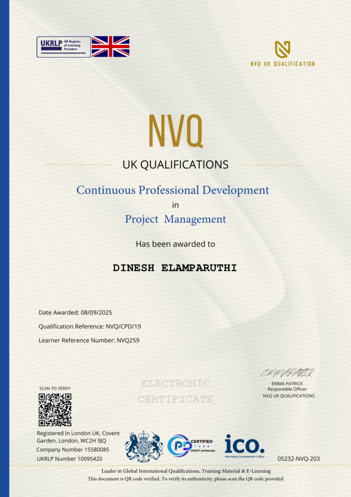 This Certificate is authentic and was issued by NVQ UK Qualification to DINESH ELAMPARUTHI on 08 SEPTEMBER 2025.