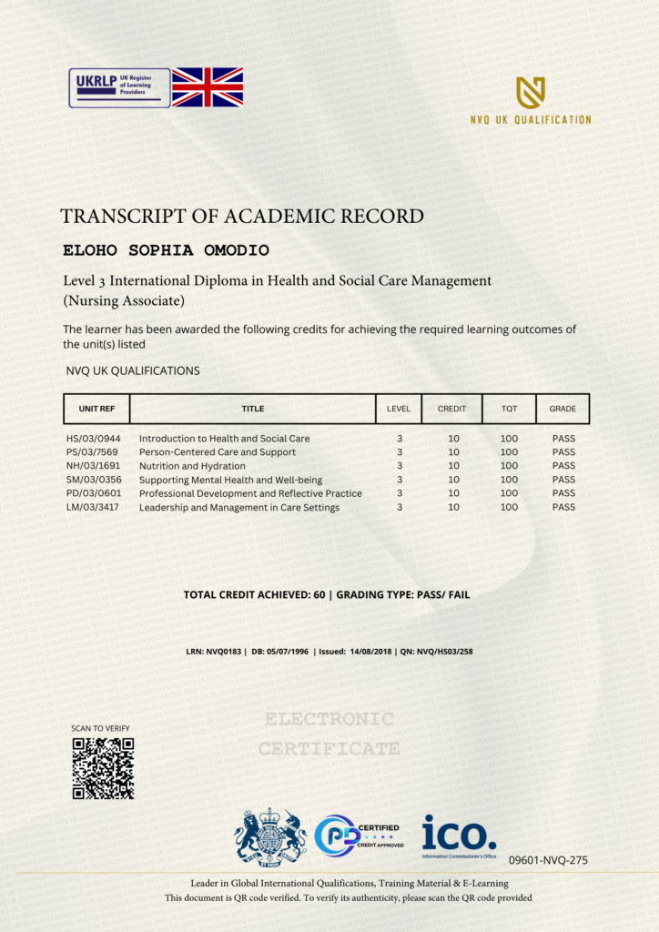 This Certificate is authentic and was issued by NVQ UK Qualification to ELOHO SOPHIA OMODIO on 14 AUGUST 2018.