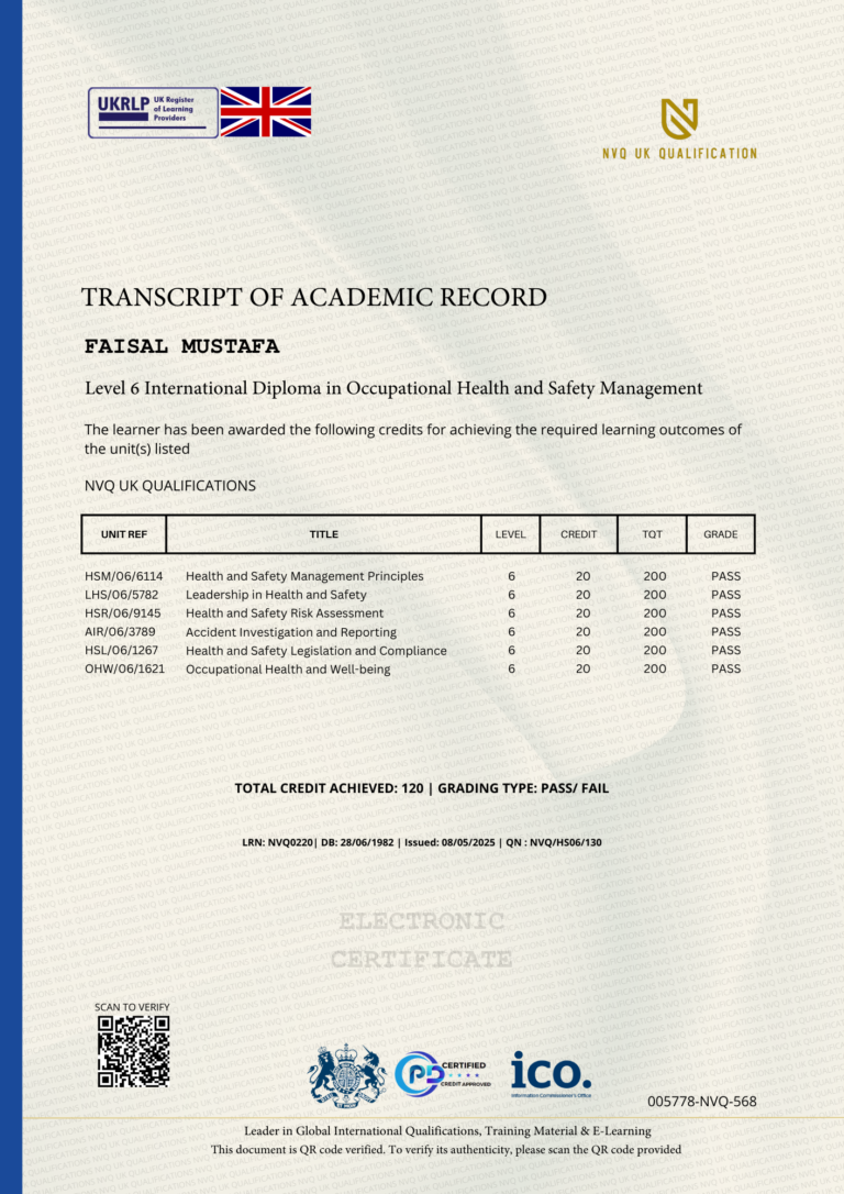 This Certificate is authentic and was issued by NVQ UK Qualification to FAISAL MUSTAFA on 08 MAY 2025.