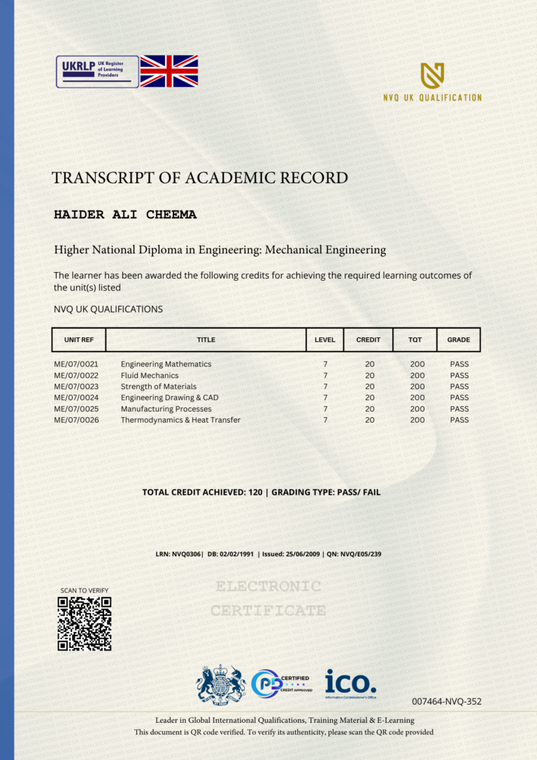 This Certificate is authentic and was issued by NVQ UK Qualification to HAIDER ALI CHEEMA on 25 JUNE 2009.