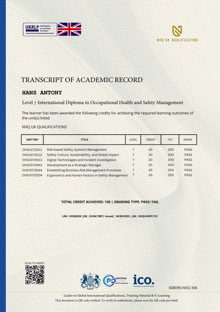 This Certificate is authentic and was issued by NVQ UK Qualification to HANS ANTONY on 18 AUGUST 2025.