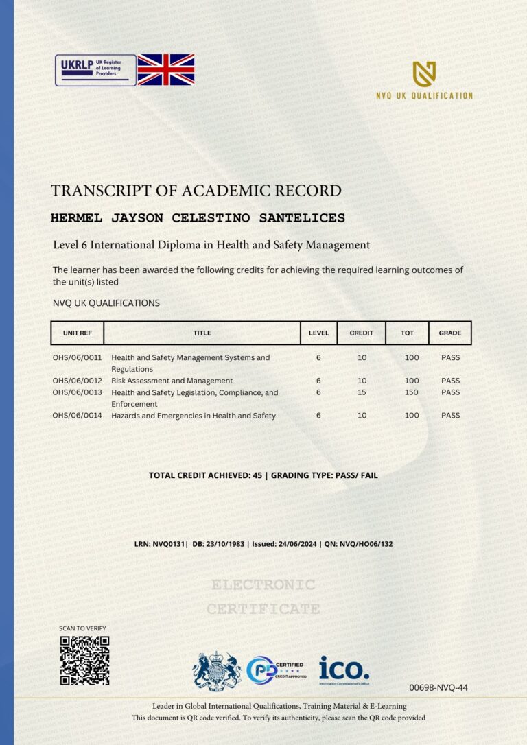 This Certificate is authentic and was issued by NVQ UK Qualification to HERMEL JAYSON CELESTINO SANTELICES on 24 JUNE 2024.