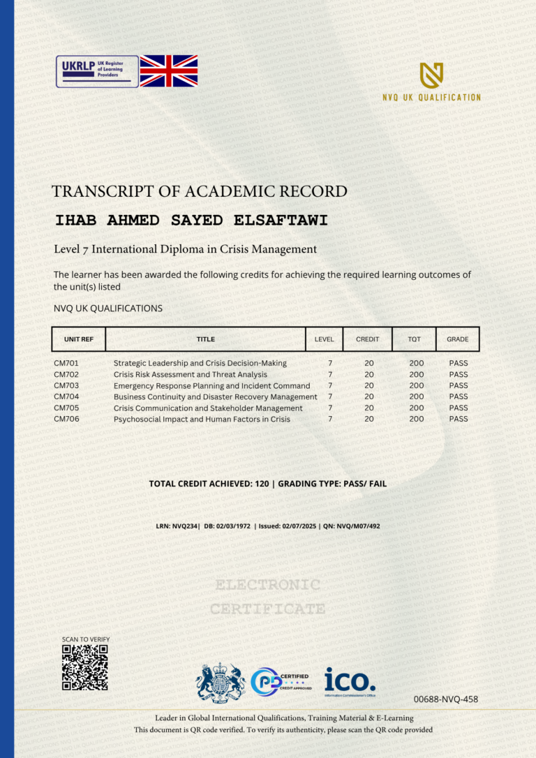 This Certificate is authentic and was issued by NVQ UK Qualification to IHAB AHMED SAYED ELSAFTAWI on 02 JULY 2025.