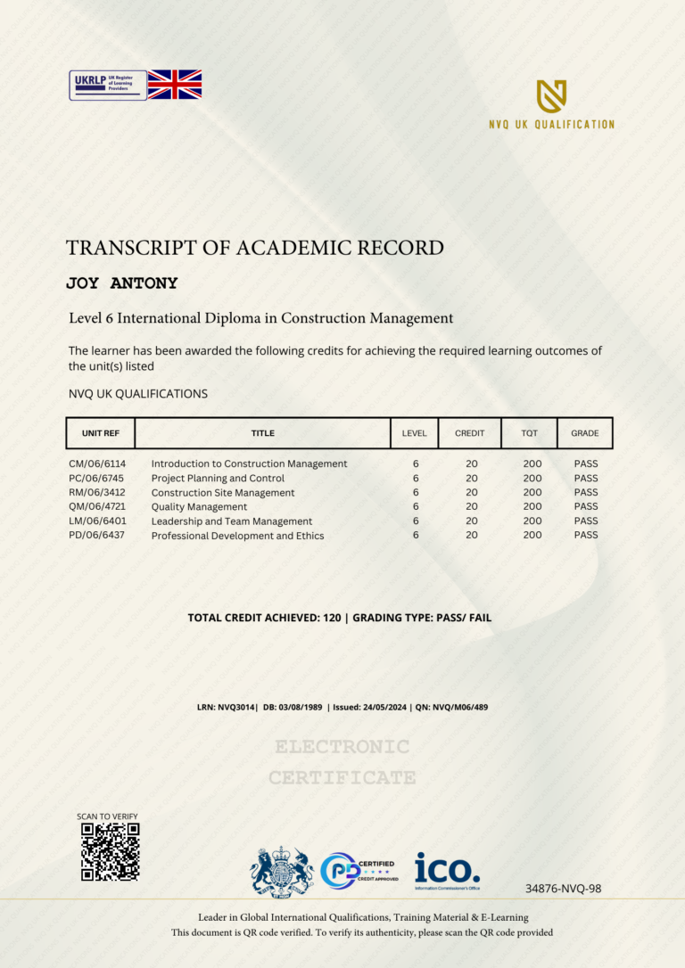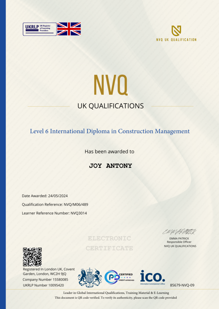 This Certificate is authentic and was issued by NVQ UK Qualification to JOY ANTONY on 24 MAY 2024