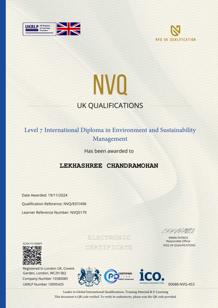This Certificate is authentic and was issued by NVQ UK Qualification to LEKHASHREE CHANDRAMOHAN on 19 NOVEMBER 2024.