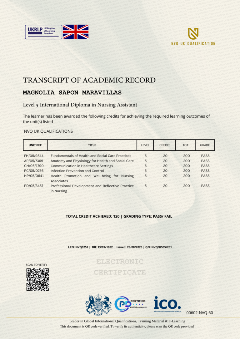 This Certificate is authentic and was issued by NVQ UK Qualification to MAGNOLIA SAPON MARAVILLAS on 28 AUGUSTĀ 2025.