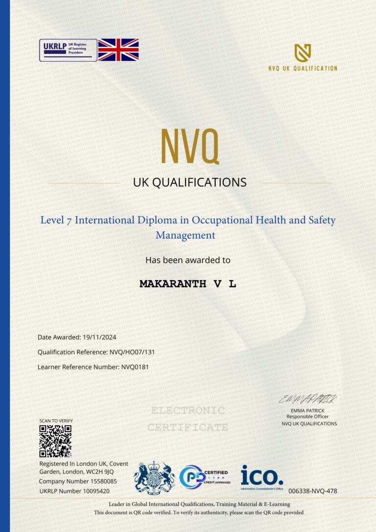 This Certificate is authentic and was issued by NVQ UK Qualification to MAKARANTH VL on 19 NOVEMBER 2024.