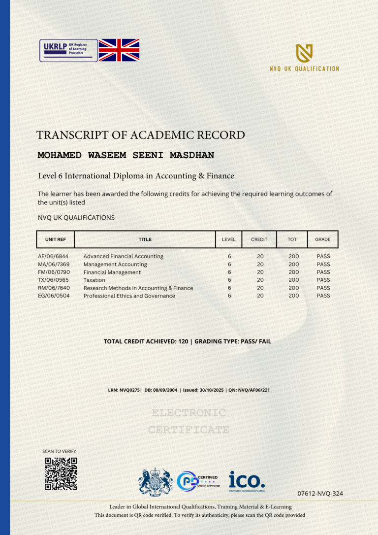 This Certificate is authentic and was issued by NVQ UK Qualification to MOHAMED WASEEM SEENI MASDHAN on 30 OCTOBER  2025.