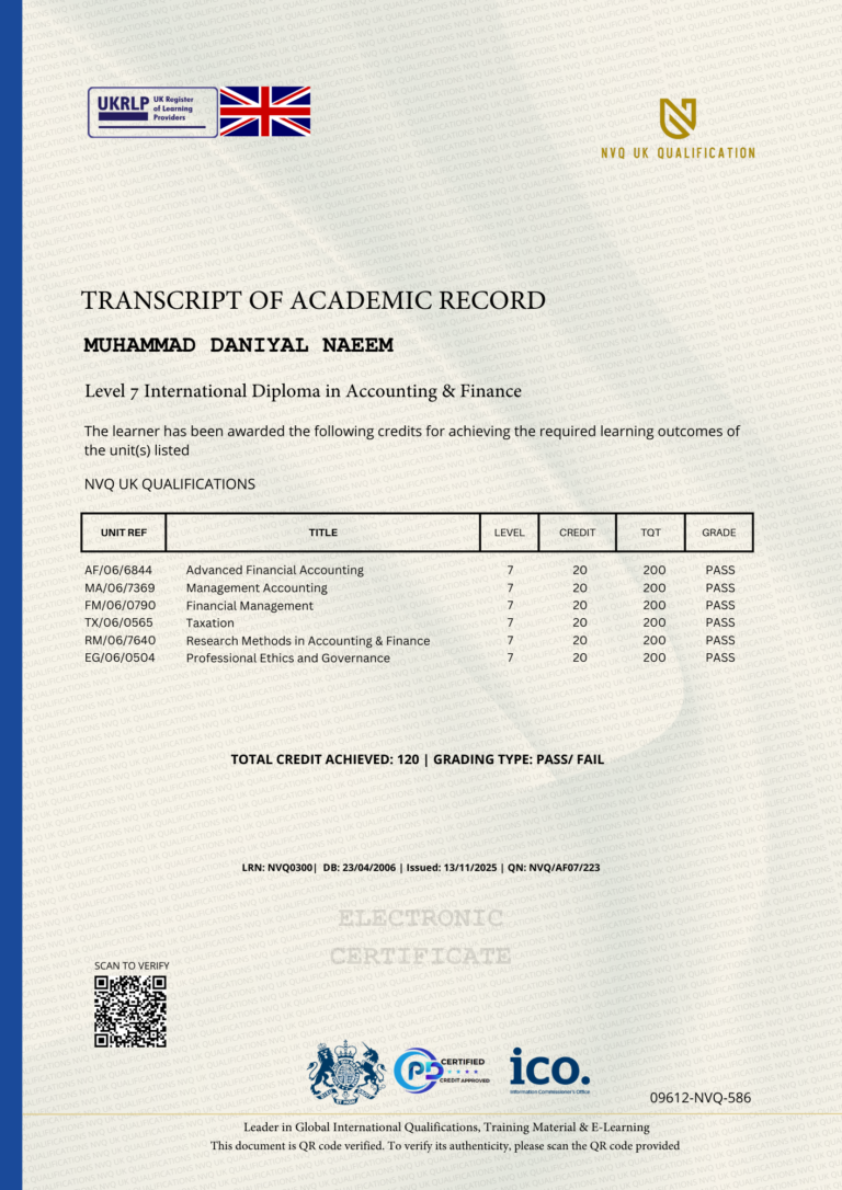 This Certificate is authentic and was issued by NVQ UK Qualification to MUHAMMAD DANIYAL NAEEM on 13 NOVEMBER  2025.