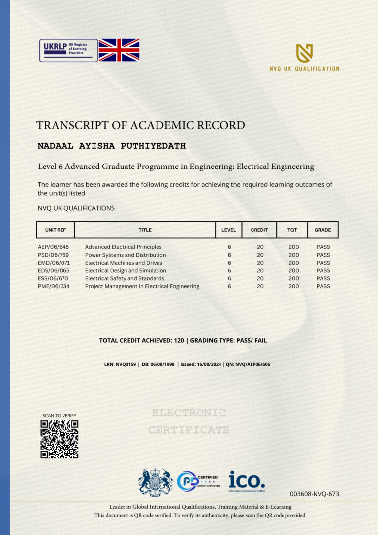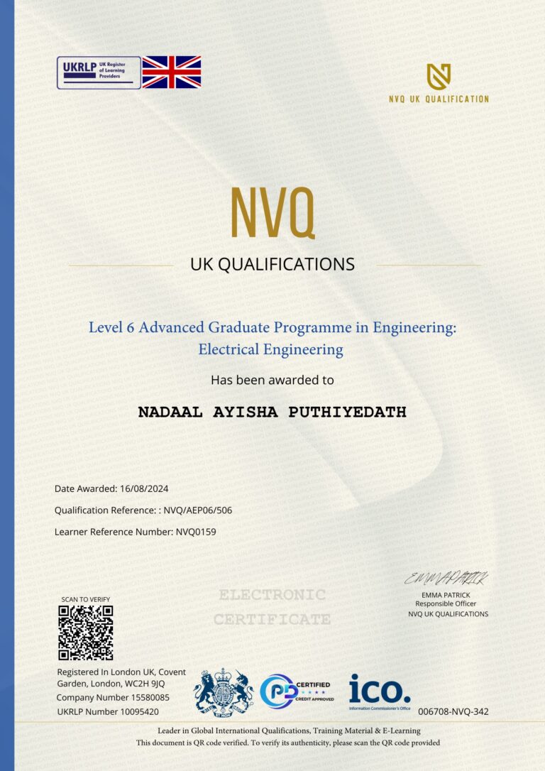 This Certificate is authentic and was issued by NVQ UK Qualification to NADAAL AYISHA PUTHIYEDATH on 16 AUGUST 2024.