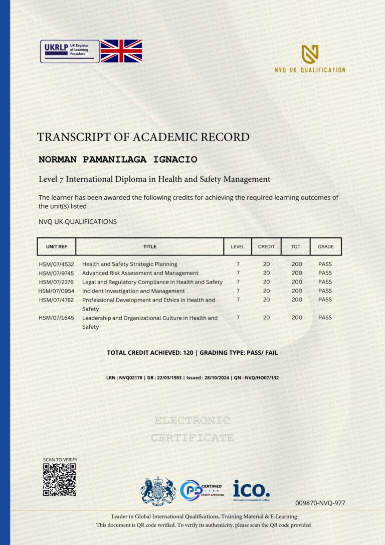 This Certificate is authentic and was issued by NVQ UK Qualification to NORMAN PAMANILAGA IGNACIO on 28 OCTOBER 2024.