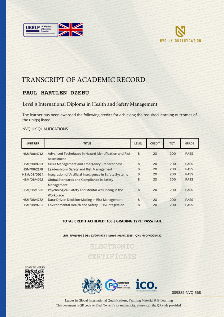 This Certificate is authentic and was issued by NVQ UK Qualification to PAUL HARTLEN DZEBU on 06 JANUARY 2025.