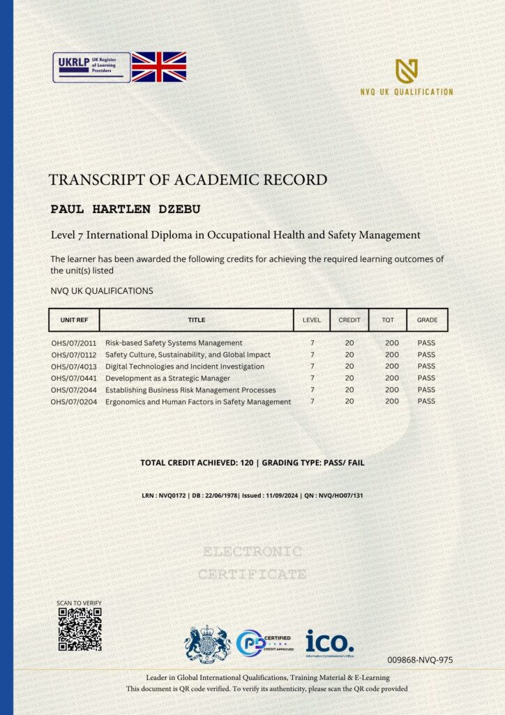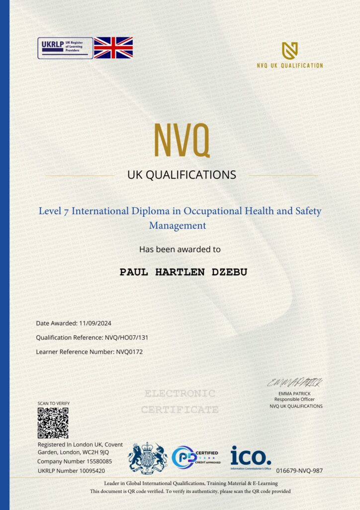 This Certificate is authentic and was issued by NVQ UK Qualification to PAUL HARTLEN DZEBU on 11 SEPTEMBER 2024.