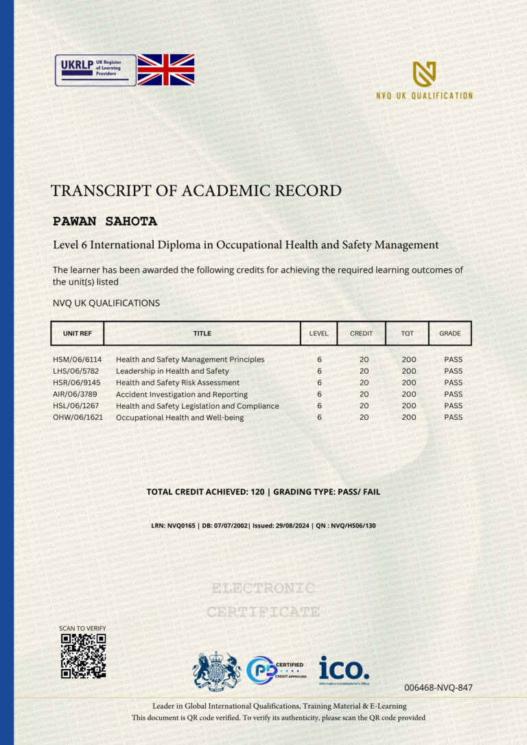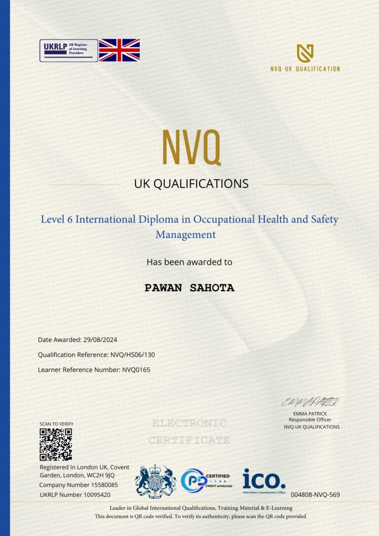 This Certificate is authentic and was issued by NVQ UK Qualification to PAWAN SAHOTA on 29 AUGUST, 2024.