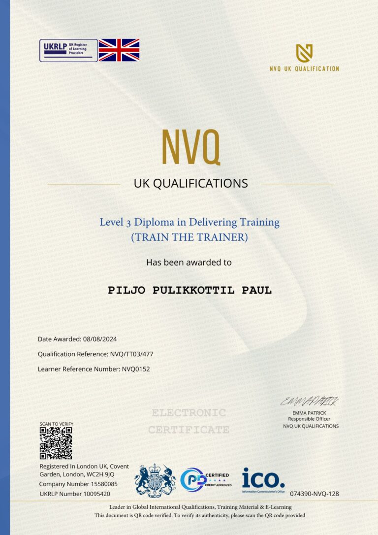 This Certificate is authentic and was issued by NVQ UK Qualification to PILJO PULIKKOTTIL PAUL on 08 AUGUST 2024.