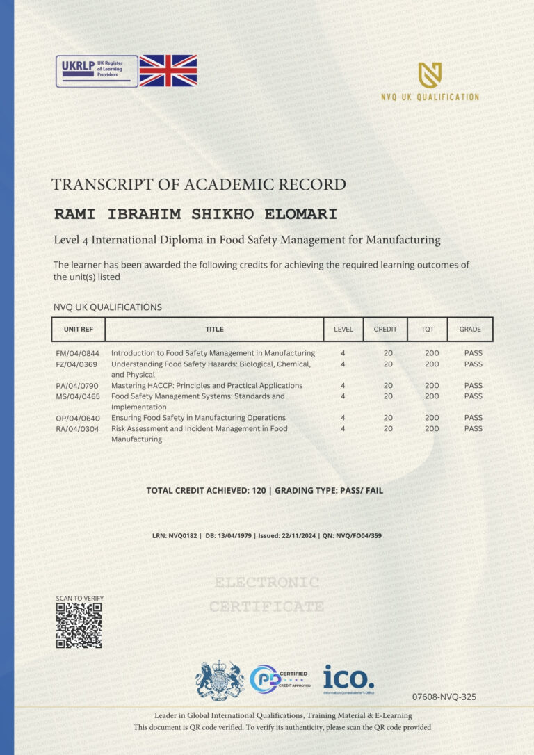 This Certificate is authentic and was issued by NVQ UK Qualification to RAMI IBRAHIM SHIKHO ELOMARI on 22 NOVEMBER 2024.