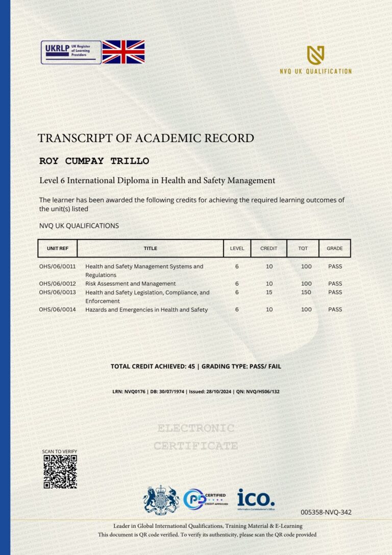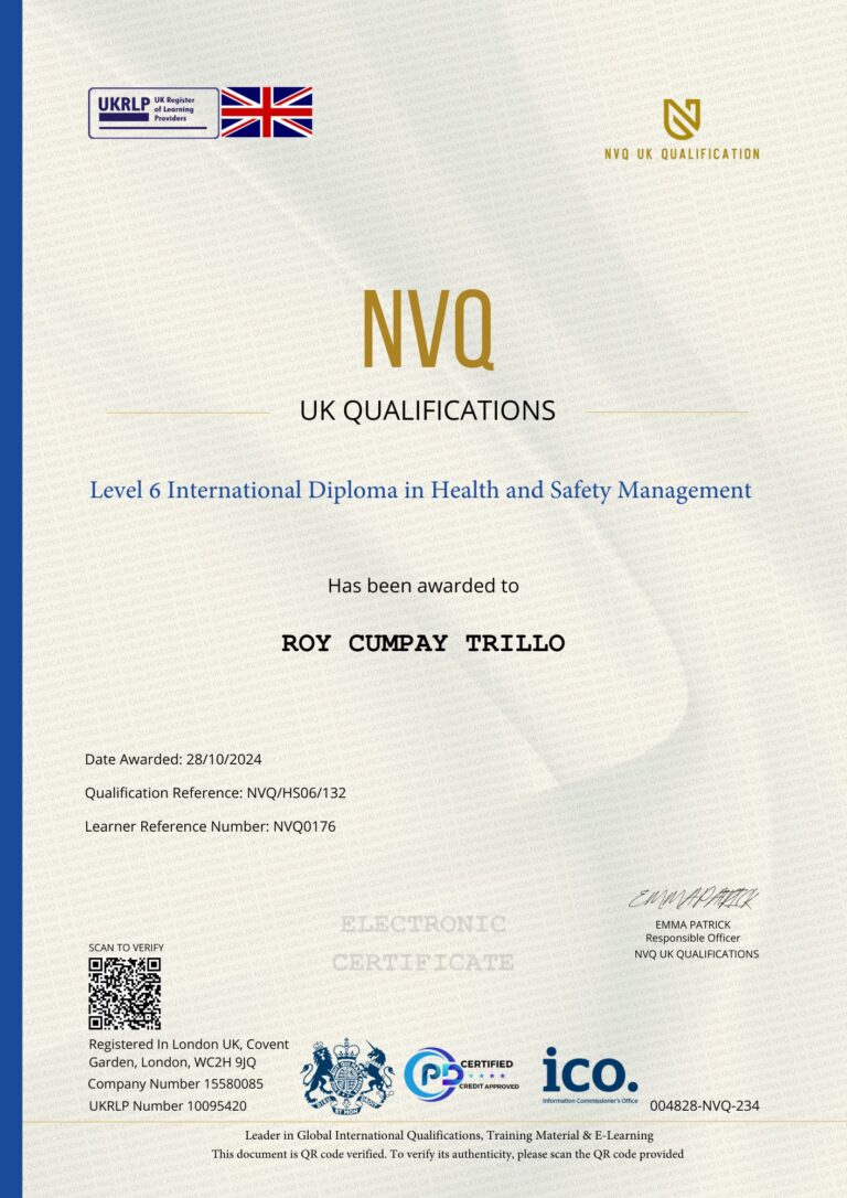 This Certificate is authentic and was issued by NVQ UK Qualification to ROY CUMPAY TRILLO on 28 OCTOBER 2024.