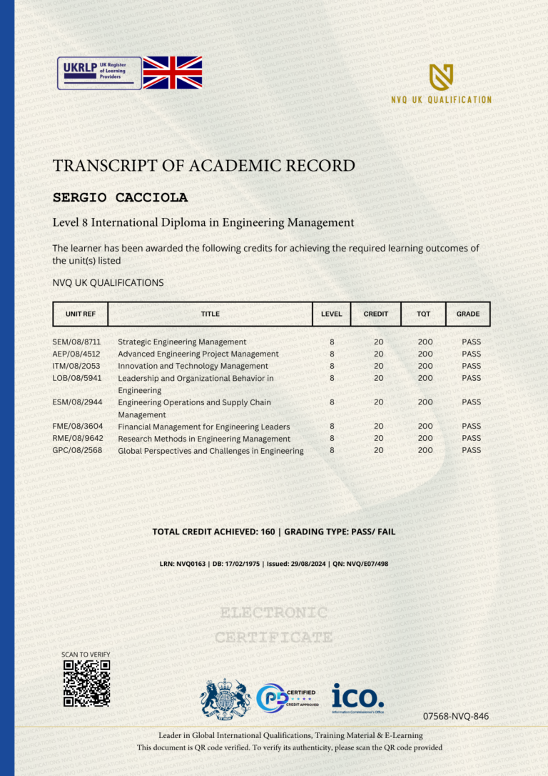 This Certificate is authentic and was issued by NVQ UK Qualification to SERGIO CACCIOLA on 29 AUGUST 2024.