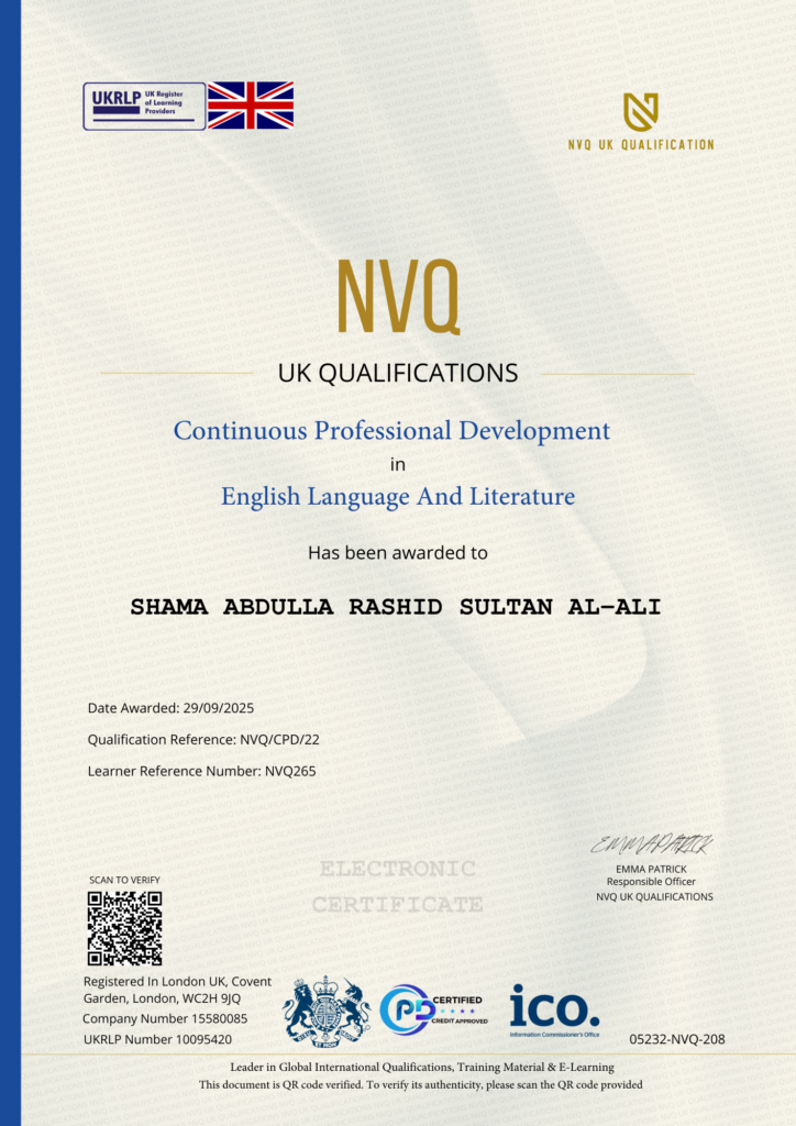 This Certificate is authentic and was issued by NVQ UK Qualification to SHAMA ABDULLA RASHID SULTAN AL-ALI  on 29 SEPTEMBER 2025.