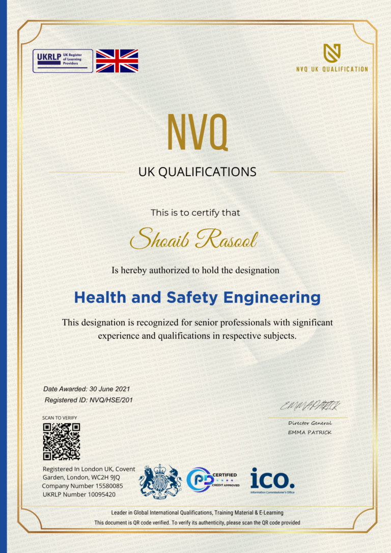 This is to certify that Shoaib Rasool has been awarded membership by NVQ UK Qualification on 30 June 2021