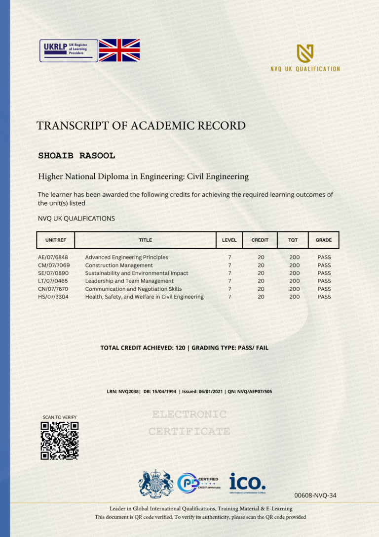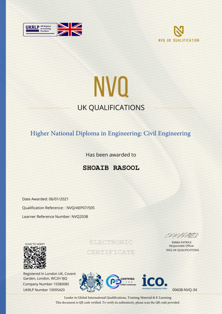 This Certificate is authentic and was issued by NVQ UK Qualification to SHOAIB RASOOL on 06 JANUARY  2021.