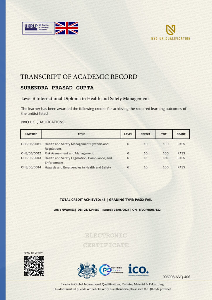This Certificate is authentic and was issued by NVQ UK Qualification to SURENDRA PRASAD GUPTA on 08 AUGUST 2024.