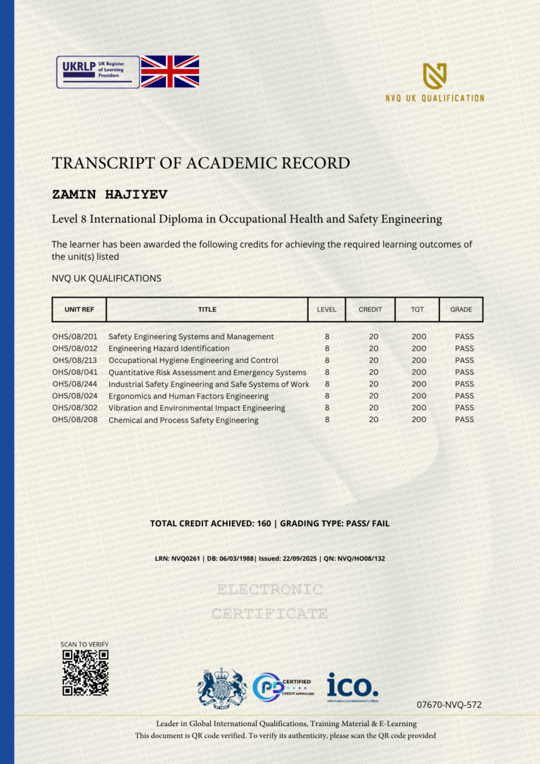 This Certificate is authentic and was issued by NVQ UK Qualification to ZAMIN HAJIYEV on 22 SEPTEMBER 2025.